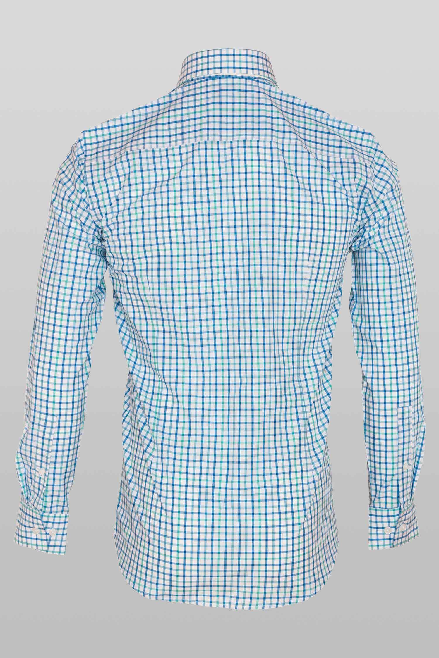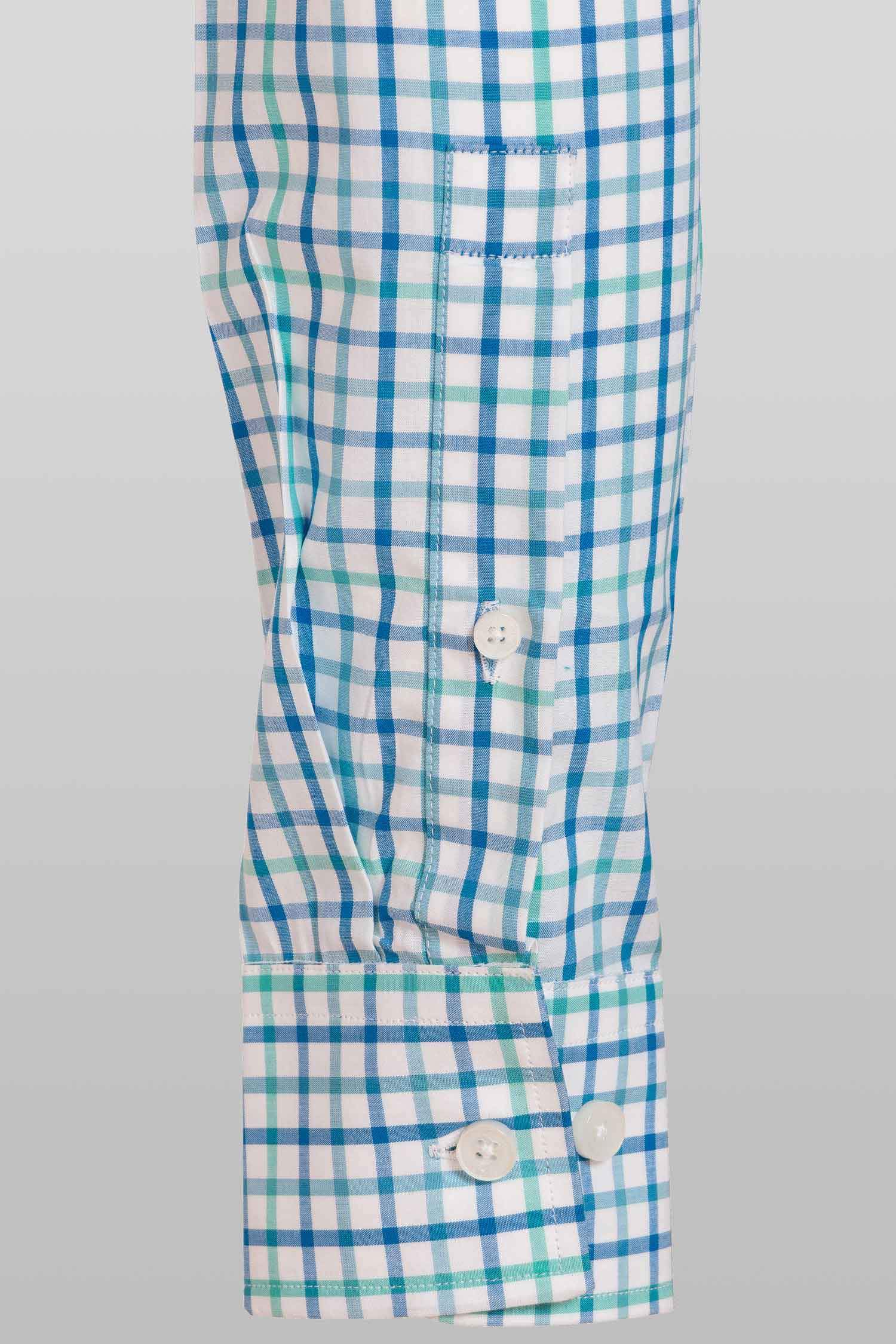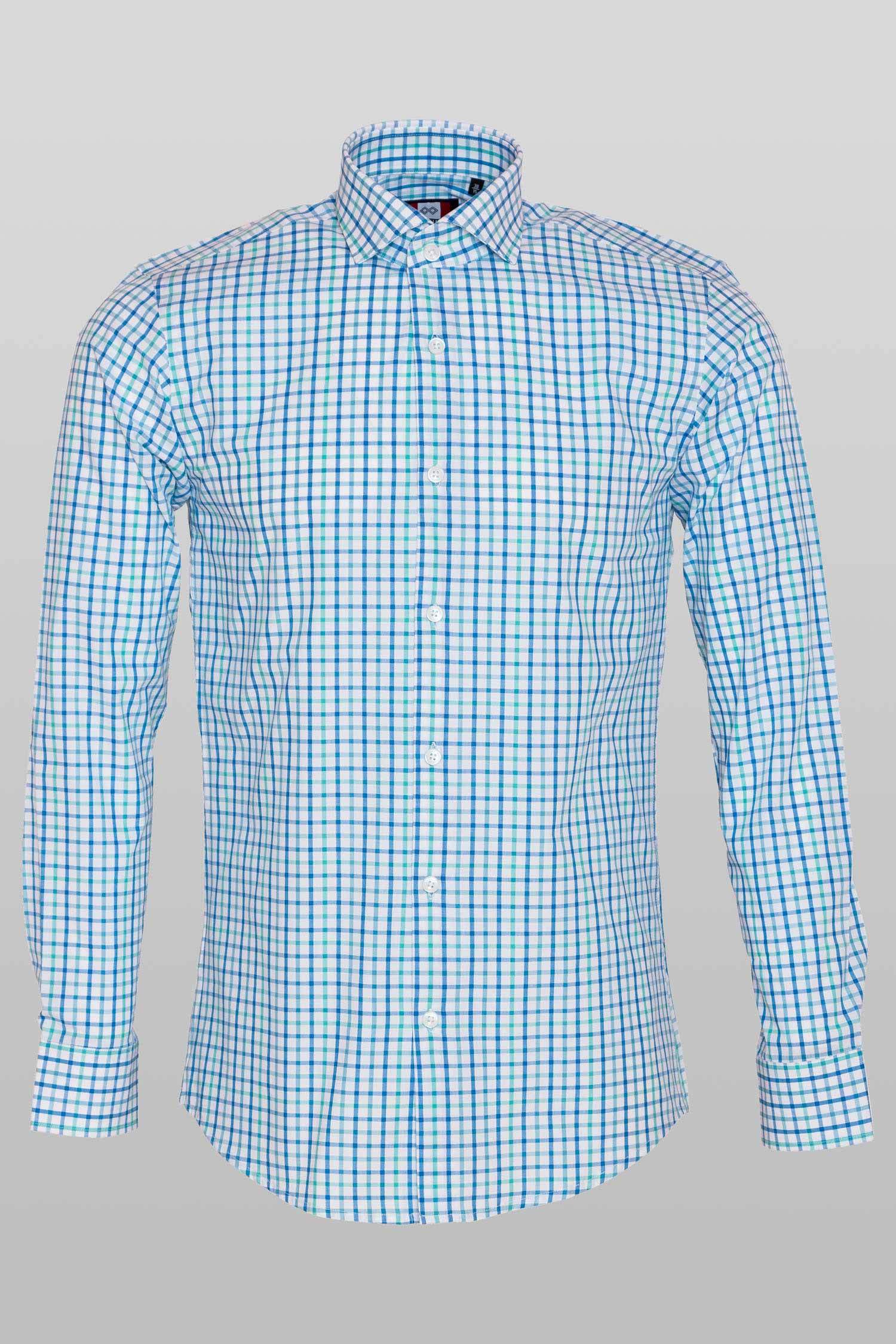 This "Freddie” dress shirt by Zingfiniti is specially crafted from premium Giza cotton for exceptional comfort and luxury feel. Decorated in thick graph checks in blue & green on white, this shirt will make a sharp addition to your weekday wardrobe. This shirt strikes an elegant balance between luxury feel and incredible performance. The shirt fabric and style gives it a contemporary, downtown appeal when ironed up or you can wear it more relaxed with a pair of jeans. This slim fit shirt features a cutaway collar and barrel cuffs with adjustable buttons. We offer complimentary Zingfiniti Sewing Kit with spare buttons & collar bones for extra care and protection. Experience the luxurious, soft and fine feel of these shirts.