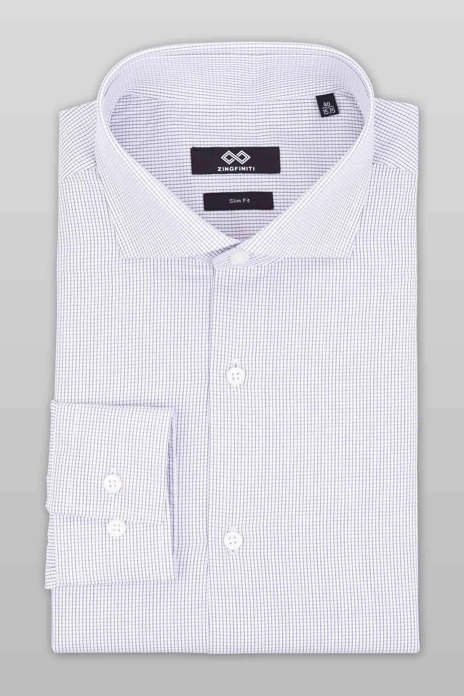 This “Elwood” dress shirt by Zingfiniti is specially crafted from premium Giza cotton for exceptional comfort and luxury feel. Decorated in a fine check pattern in white and blue, this shirt will make a sharp addition to your weekday wardrobe. This shirt strikes an elegant balance between luxury feel and incredible performance. The shirt fabric and style gives it a contemporary, downtown appeal when ironed up or you can wear it more relaxed with a pair of jeans. This slim fit shirt features a cutaway collar and barrel cuffs with adjustable buttons. We offer complimentary Zingfiniti Suit Cover and Sewing Kit with spare buttons & collar bones for extra care and protection. Experience the luxurious, soft and fine feel of these shirts.