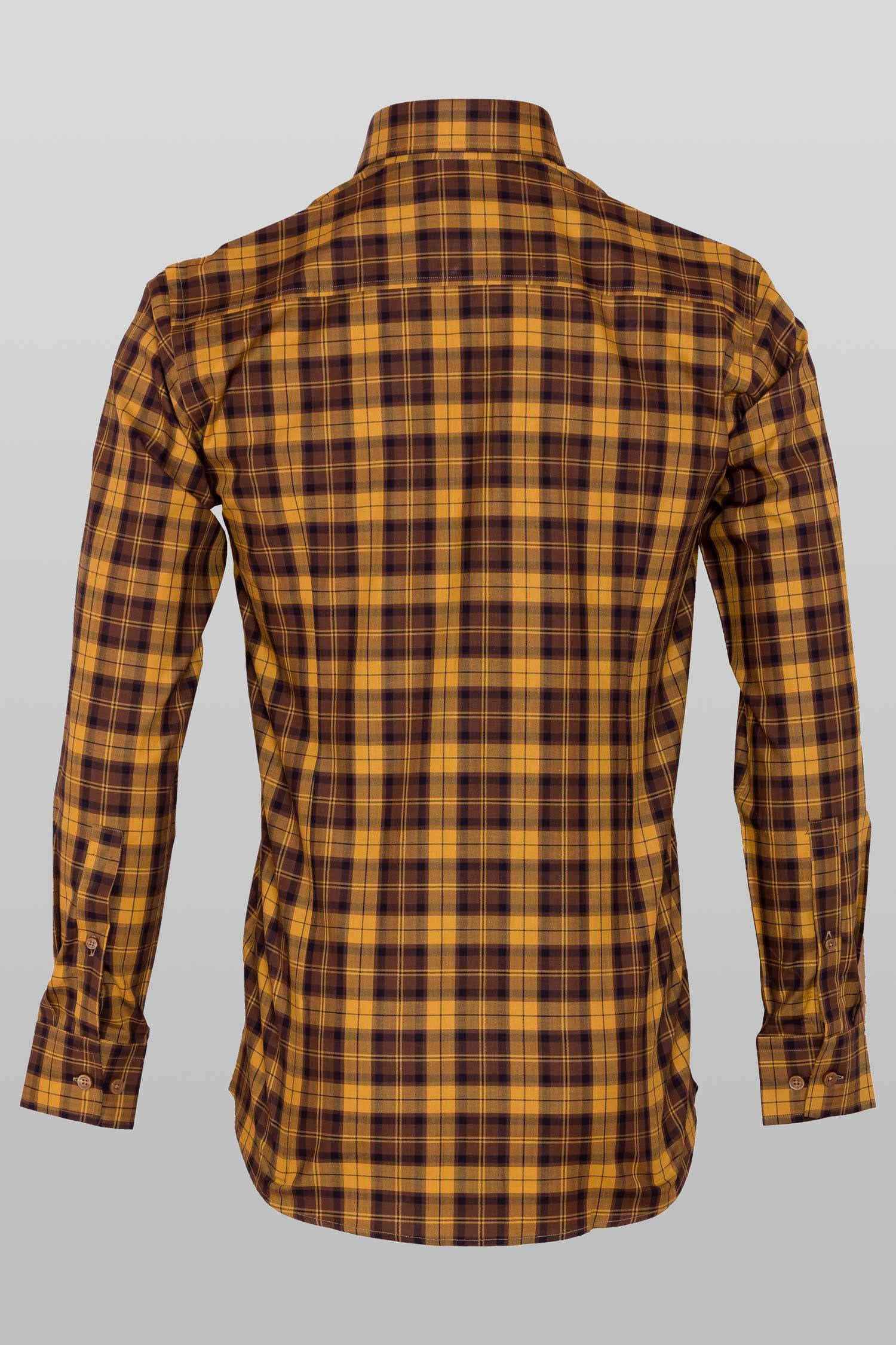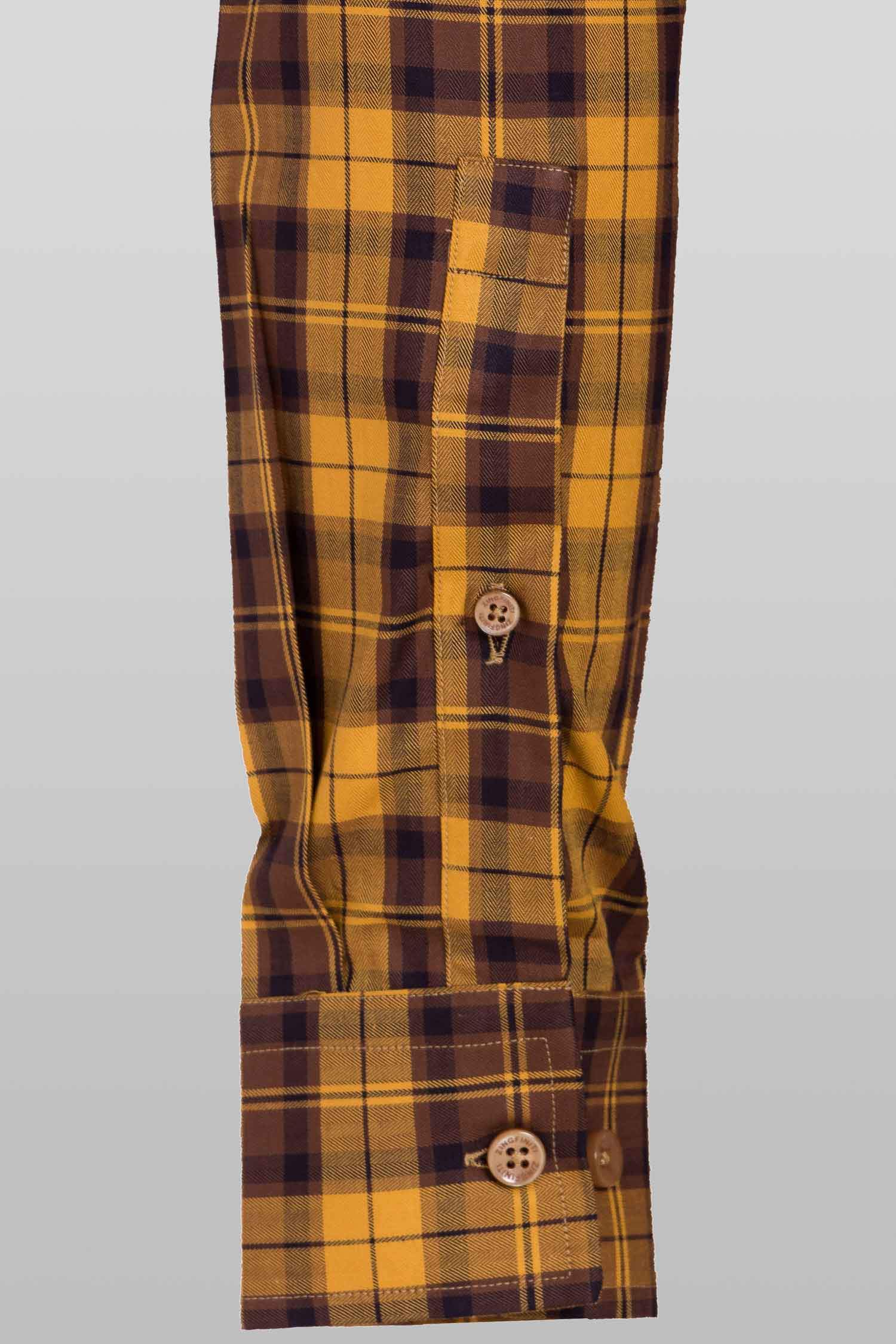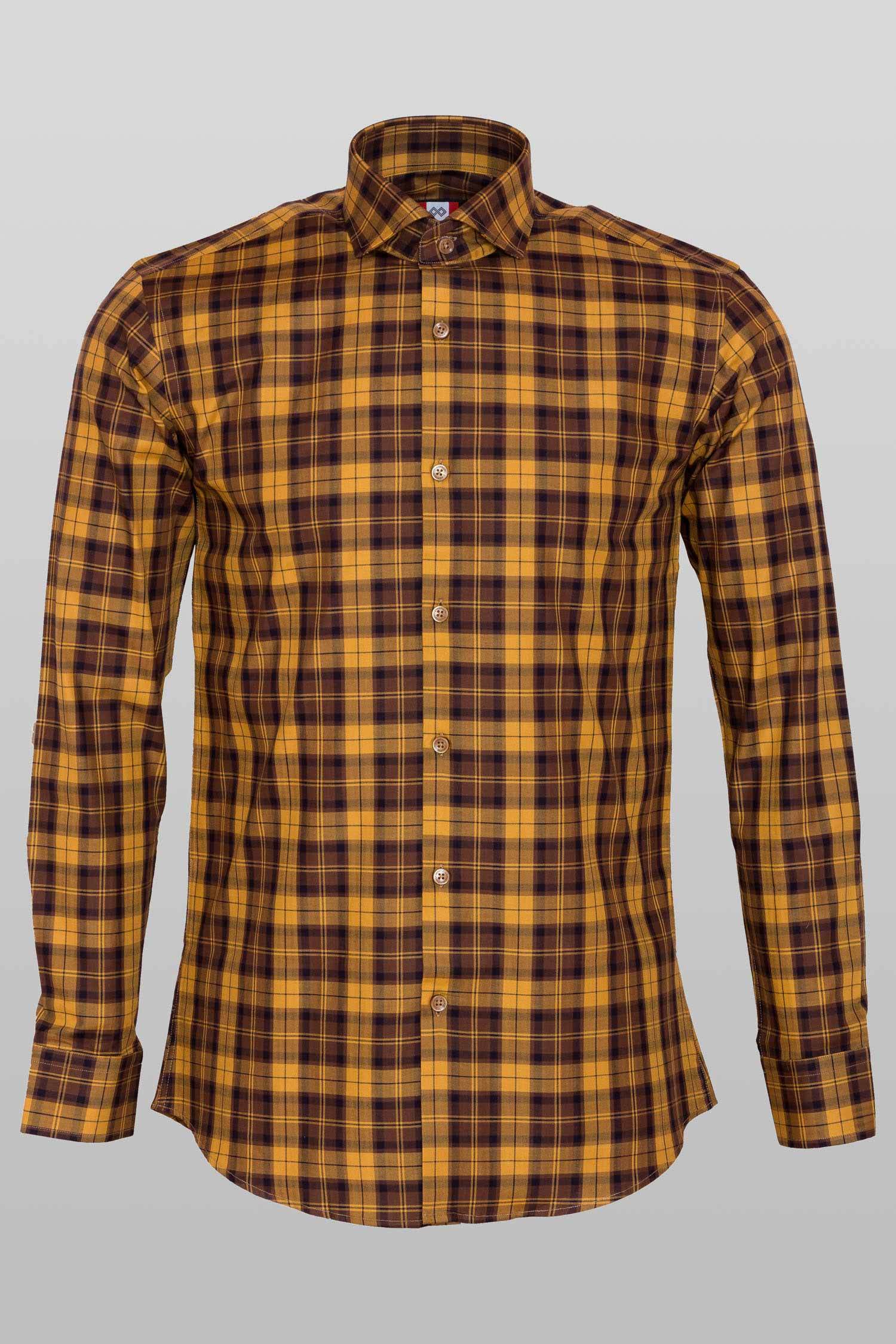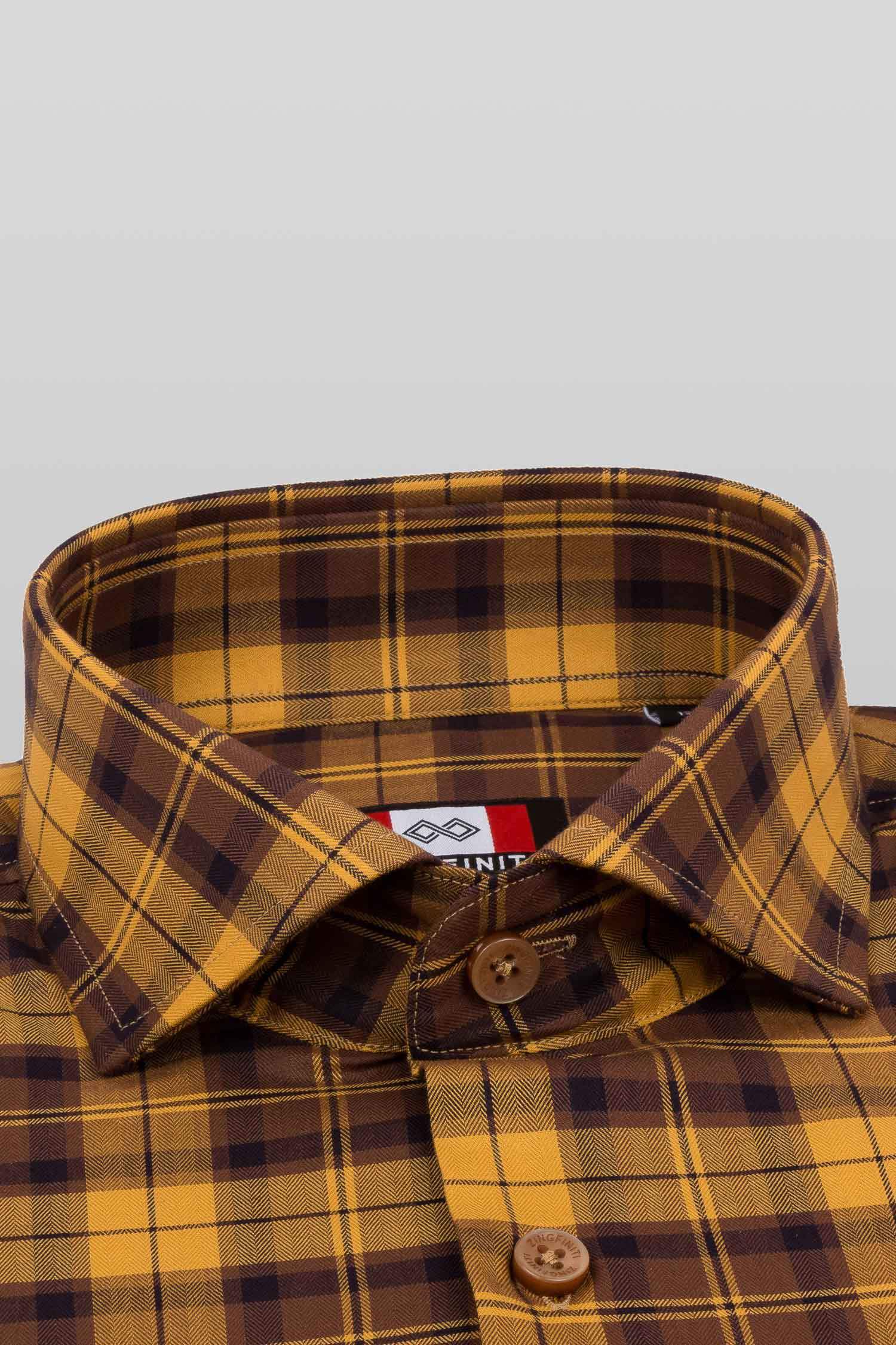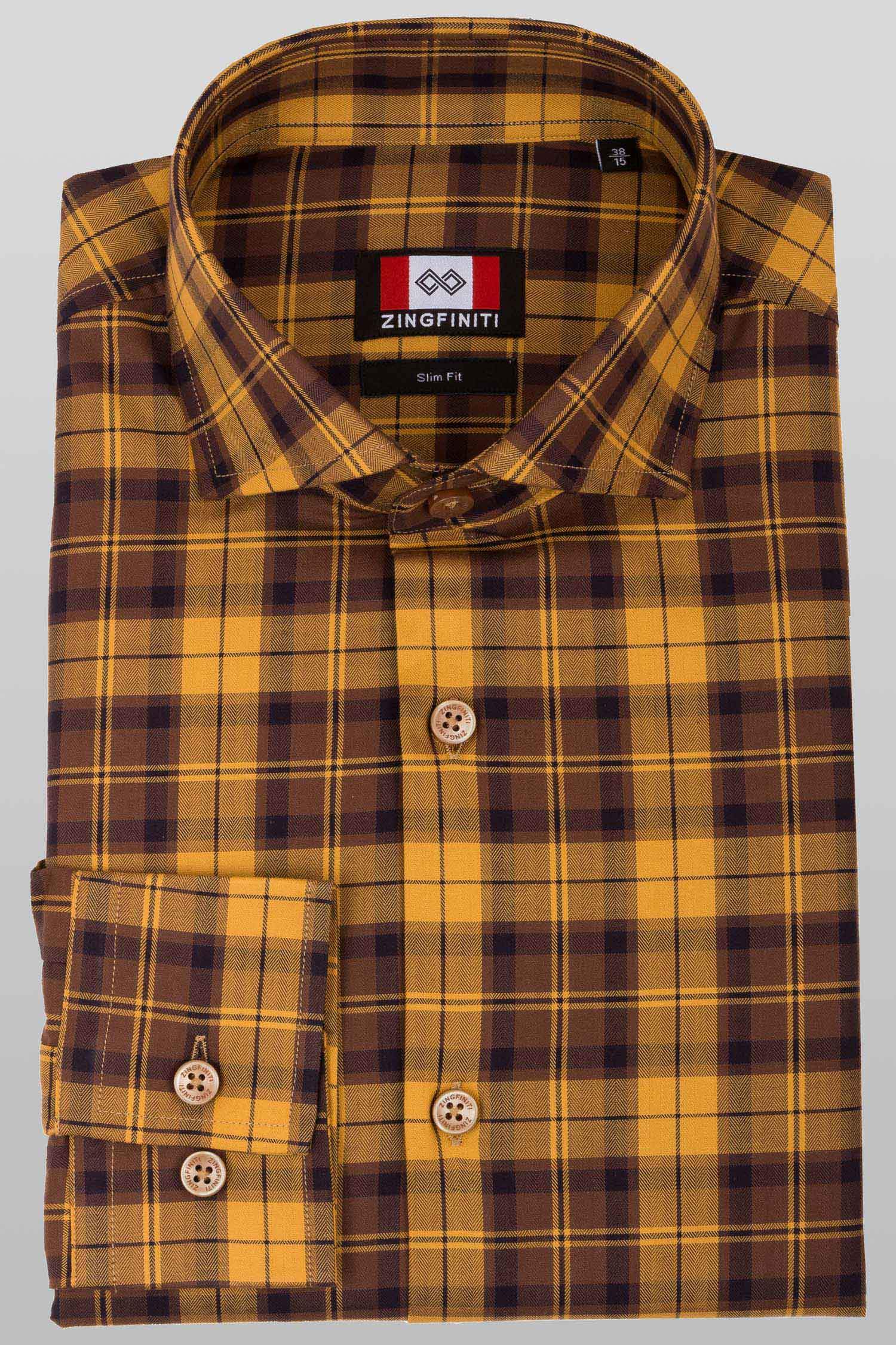 This "Trevor” dress shirt by Zingfiniti is specially crafted from premium Giza cotton for exceptional comfort and luxury feel. Decorated in Tartan check in ochre and brown , this shirt will make a sharp addition to your weekday wardrobe. This shirt strikes an elegant balance between luxury feel and incredible performance. The shirt fabric and style gives it a contemporary, downtown appeal when ironed up or you can wear it more relaxed with a pair of jeans. This slim fit shirt features a cutaway collar and barrel cuffs with adjustable buttons. We offer complimentary Zingfiniti Sewing Kit with spare buttons & collar bones for extra care and protection. Experience the luxurious, soft and fine feel of these shirts.